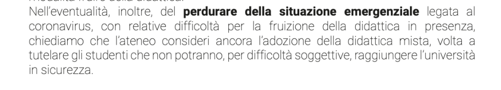 Cari studenti, la nostra richiesta di ripresa delle attività in presenza, in linea col nostro programma, si associa al mantenimento della modalità a distanza soprattutto per chi è fuorisede e ha reali difficoltà a raggiungere l’ospedale.