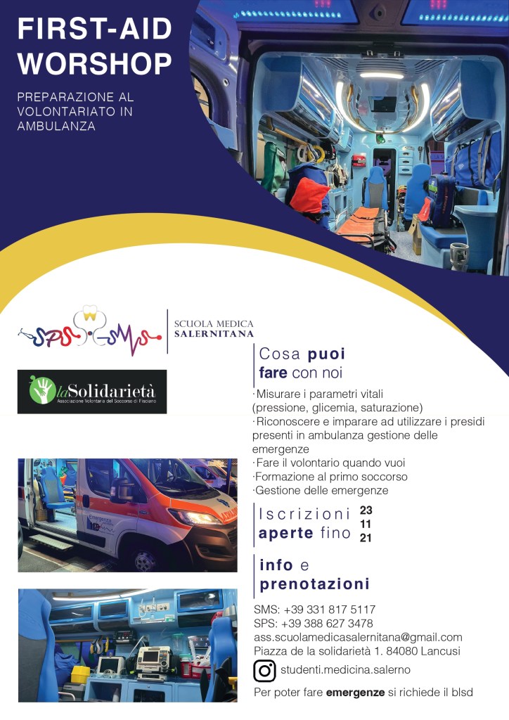 Siamo lieti di annunciarvi una nuova iniziativa in collaborazione con l’Associazione di volontariato “La Solidarietà” di Fisciano. Il progetto prevede un corso tenuto da esperti che tratteranno argomenti indispensabili per la gestione del primo soccorso (misurazione dei parametri vitali, utilizzo dei presidi sanitari presenti in ambulanza,…) e delle emergenze. Le prime due lezioni saranno a frequenza obbligatoria in quanto fondamentali per la comprensione e l’utilizzo dei presidi sanitari presenti in ambulanza, e propedeutiche per poter svolgere emergenze. Successivamente, chi vorrà, potrà aderire a tutti i servizi offerti da La Solidarietà quali: emergenza sanitaria (sarà obbligatorio il certificato BLSD), trasporto infermi, trasferimenti Covid, affiancamento con medici e infermieri in emergenze sulle ambulanze del S.A.U.T. messe a disposizione dall’associazione.
