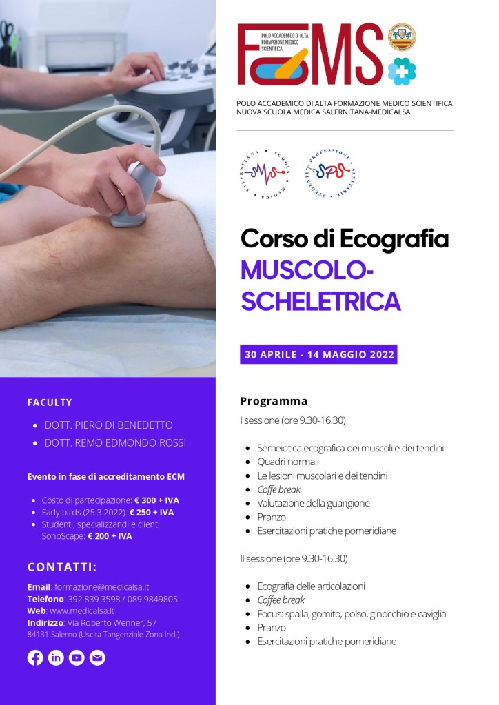 Ciao ragazzi, continua la nostra collaborazione con la scuola di formazione MedicalSa e siamo lieti di presentarvi il corso di ecografia muscoloscheletrica! Questo corso è di livello medio-avanzato, essendo indirizzato a studenti di medicina degli ultimi anni che abbiano interesse per l’ortopedia, per gli studenti di fisioterapia, laureati e specializzandi. Le informazioni principali sono tutte in locandina, ma per eventuali dubbi potete scrivere alla scuola di formazione o alla nostra pagina! Per iscrivervi, come sempre, basterà inviare una mail all’indirizzo in locandina specificando di aver saputo dell’evento tramite la nostra pagina per poter usufruire del prezzo ridotto!