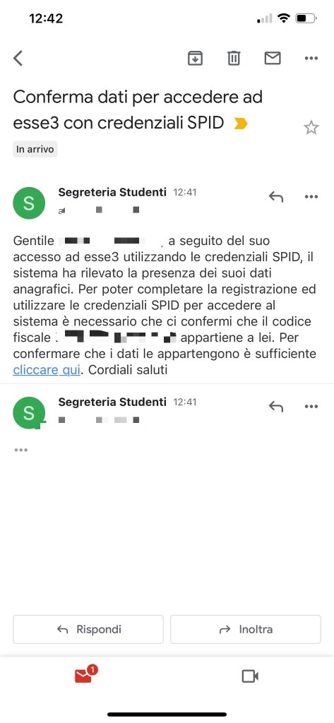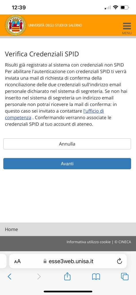 Buongiorno ragazzi, come ben sapete, da oggi è possibile accedere a esse3 soltanto con l’identità digitale SPID. In primis, invitiamo chiunque non lo abbia fatto ancora, ad attivare le proprie credenziali SPID. Fatto questo, bisogna effettuare il primo accesso con le credenziali spid al servizio esse3 e ci comparirà un messaggio di verifica delle credenziali. Sulla mail personale (non quella istituzionale) indicata precedentemente su esse3, arriverà una mail dai servizi di ateneo in cui, tramite un link, sarà permessa la verifica delle credenziali spid!