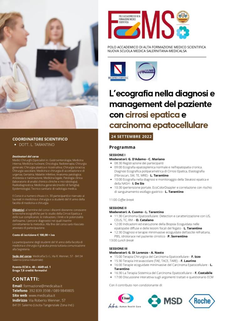 il corso “L’ ecografia nella diagnosi e management del paziente con cirrosi epatica e carcinoma epatocellulare”, che si terrà presso la loro sede in Via Wenner (Salerno) il 24 settembre.