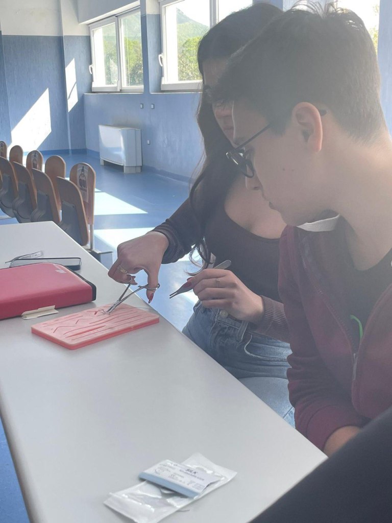 Dopo una prima parte teorica iniziale gli iscritti al corso hanno imparato a conoscere la strumentazione e le tecniche necessarie per suturare e l’importanza di saperlo fare a prescindere dalla specialità che un giorno sceglieremo.