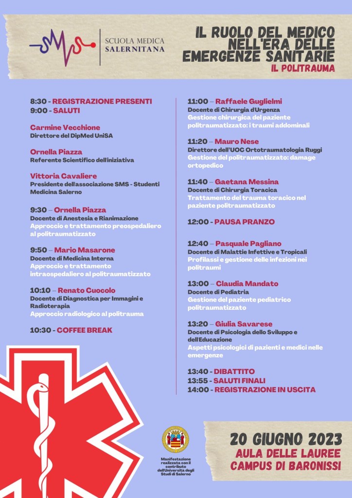L’ADE, intitolata “IL RUOLO DEL MEDICO NELL’ERA DELLE EMERGENZE SANITARIE – IL POLITRAUMA”, si terrà il giorno 20 giugno presso l’aula delle lauree del Campus di Baronissi a partire dalle ore 9 alle ore 15.