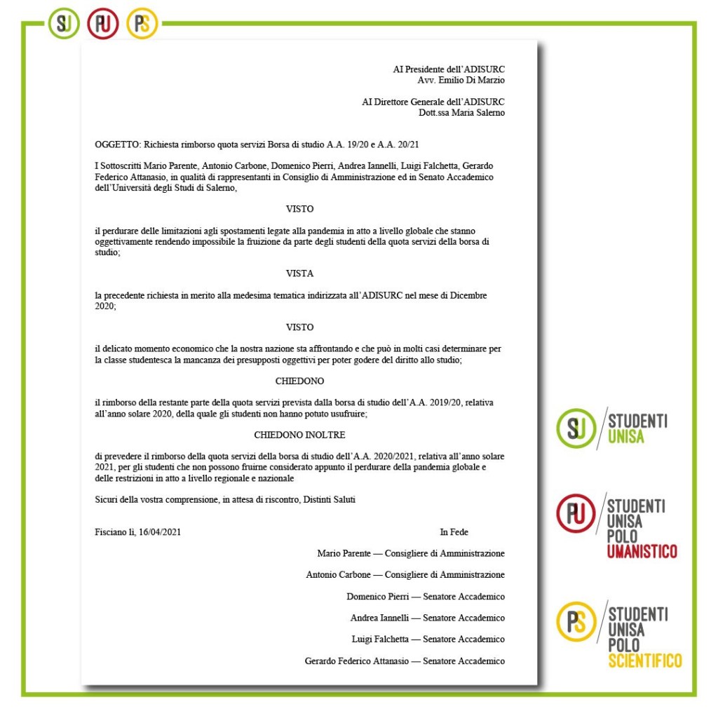 Si informa tutta la classe studentesca che, in seguito alla proposta del gruppo Studenti Unisa del 16 Aprile 2021, è stato previsto l’annullamento della trattenuta mensa per l’anno accademico 2020/2021.