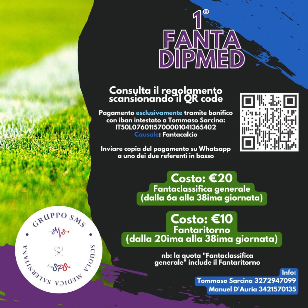Buongiorno fantallenatori e fantallenatrici del DIPMED, il Gruppo SMS è lieto di presentare la prima edizione del FANTADIPMED. Da oggi non condivideremo solo gioie, dolori ed esperienze fra il campus e l’ospedale ma anche colpi di fortuna, talenti e pianti delle domeniche fantacalcistiche 🥳