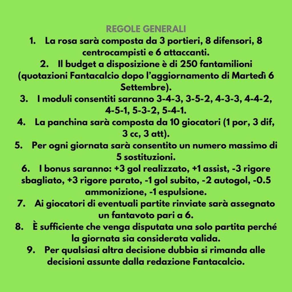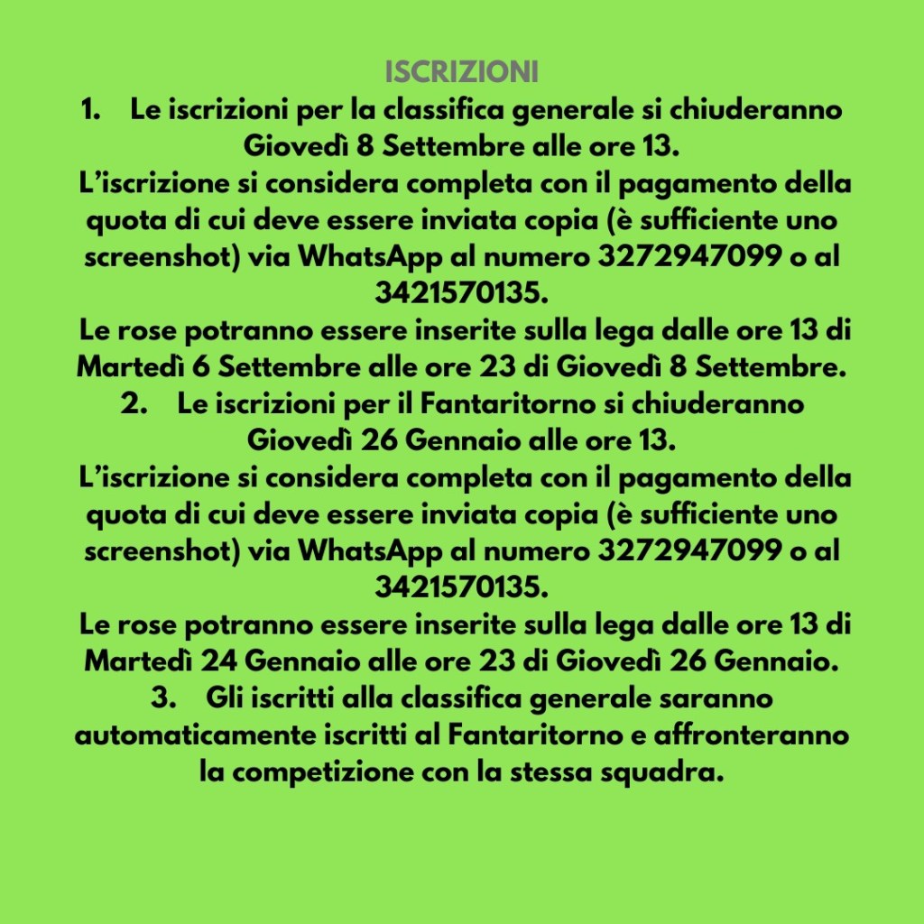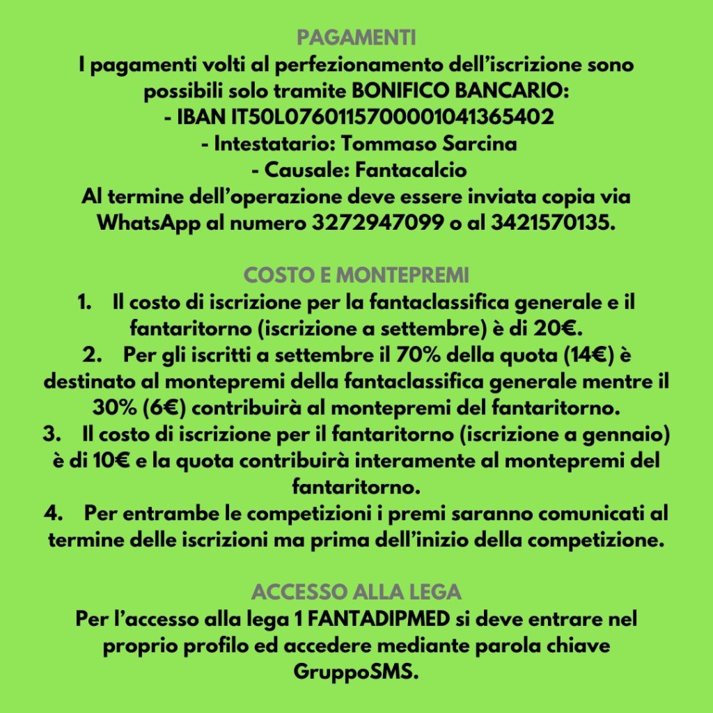 Come iscriversi? Esclusivamente tramite bonifico intestato a Tommaso Sarcina IBAN: IT50L0760115700001041365402 Causale: fantacalcio