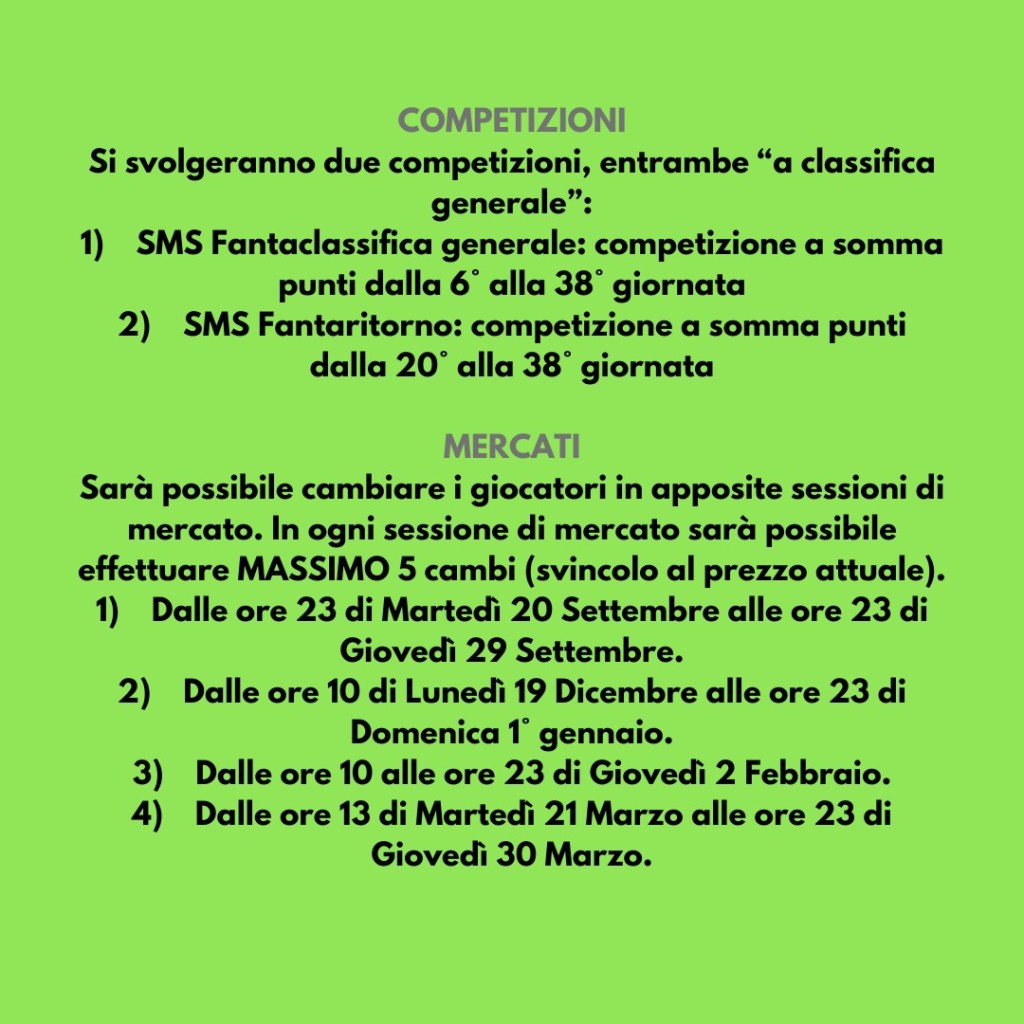 Il Fantacalcio è articolato su due competizioni “a classifica generale”: 1) Fantaclassifica generale (6°-38° giornata) 2) FantaRitorno (20°-38° giornata)