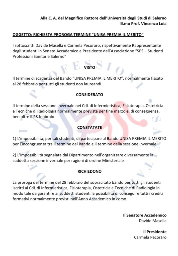 Salve ragazzi, ieri abbiamo richiesto la proroga di “Unisa Premia il Merito” agli organi competenti inviando direttamente al Rettore la richiesta qui allegata. Troviamo davvero ingiusto che il termine di scadenza del bando sia fissato prima del termine della nostra sessione invernale impedendo a molti di noi di parteciparvi.