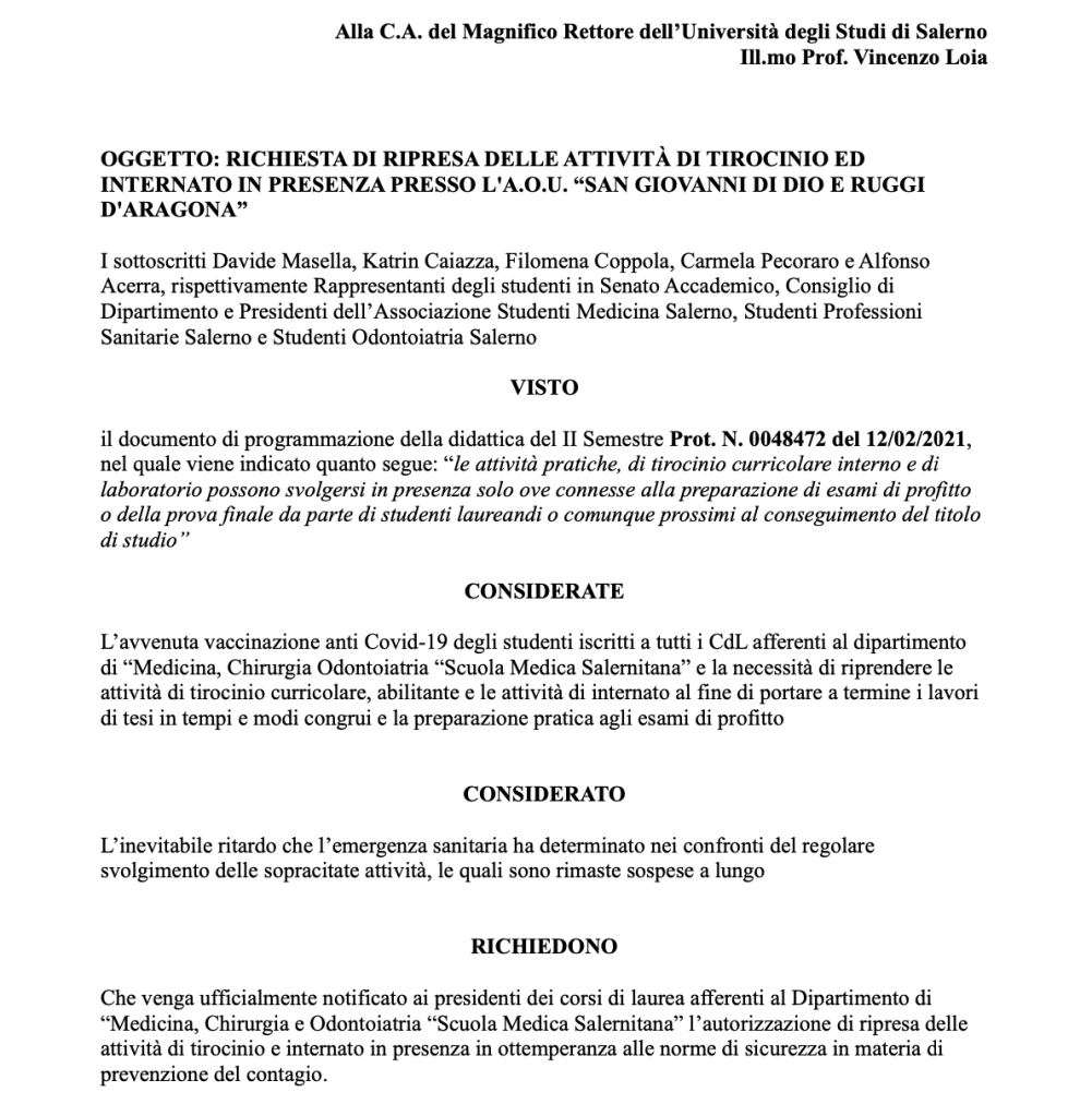 Buon pomeriggio ragazzi, il gruppo SMS oggi ha inviato una richiesta di ripresa delle attività di tirocinio ed internato in presenza al Rettore Loia. Troviamo assurdo che nonostante le vaccinazioni a moltissimi studenti non sia ancora garantito il rientro in presenza per lo svolgimento di tirocini curruculari e internati. Abbiamo richiesto un’autorizzazione ufficiale al Dipartimento per il nostro rientro in presenza in ottemperanza alle norme di sicurezza in materia di prevenzione del contagio.