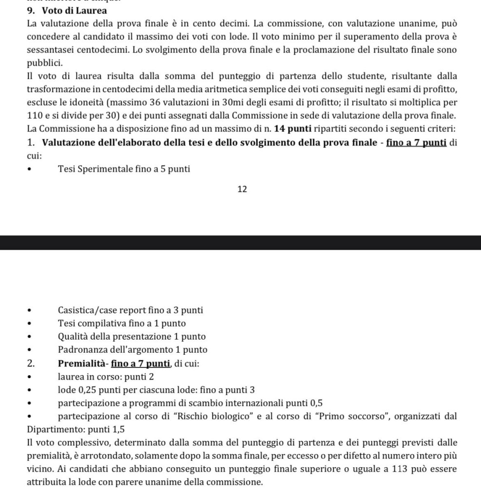 L’attuale punteggio prevede la possibilità di raggiungere un massimo di 14 punti (di cui fino a 7 definiti dal tipo di tesi) da sommare alla media trasformata in centodecimi/110, a fronte dei precedenti 12; in particolare vogliamo attenzionarvi due novità: abbiamo sostituito i research meeting, che come avrete potuto notare anche voi, sono molto più soggetti a variabilità, con due attività Dipartimentali (quindi organizzate a cadenza periodica) che garantiranno, se svolte entrambe, 1.5 punti. In aggiunta siamo riusciti ad ottenere 2 punti, invece dei precedenti 1.5, qualora il candidato riuscisse a laurearsi in corso (quindi entro Marzo dell’anno successivo al sesto) senza distinzioni nelle varie sessioni di laurea.