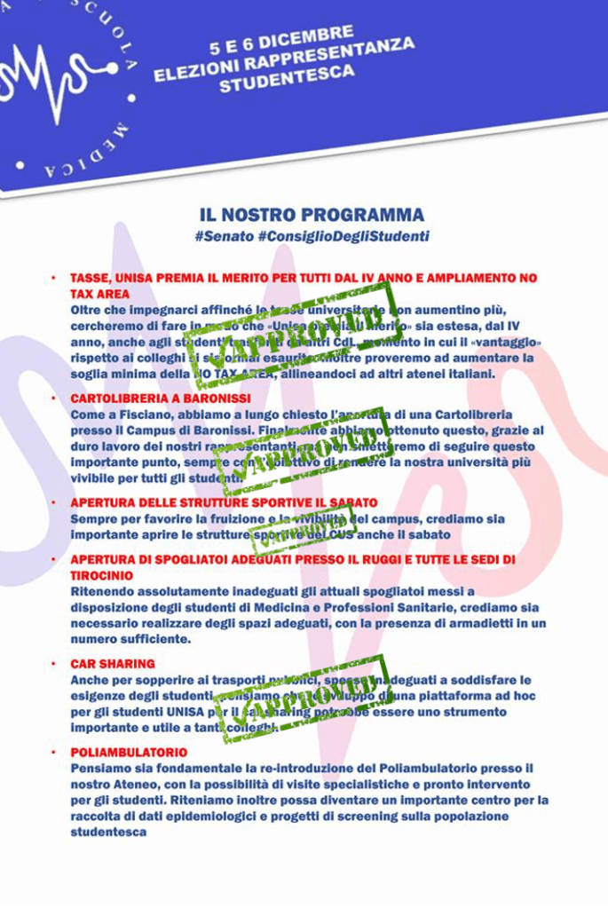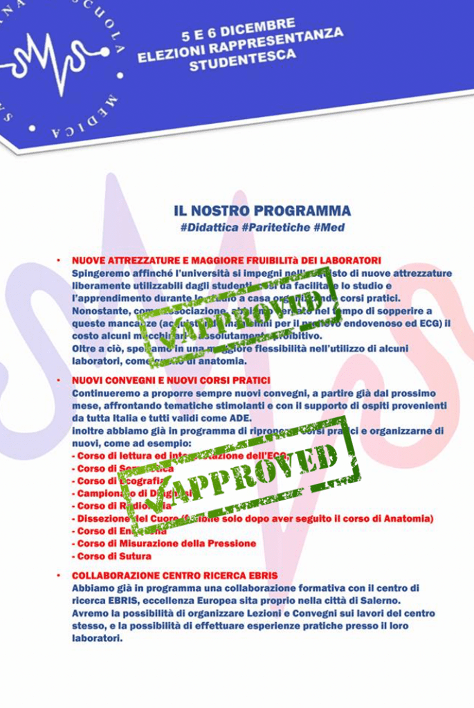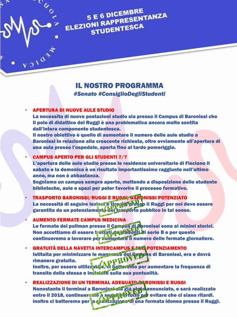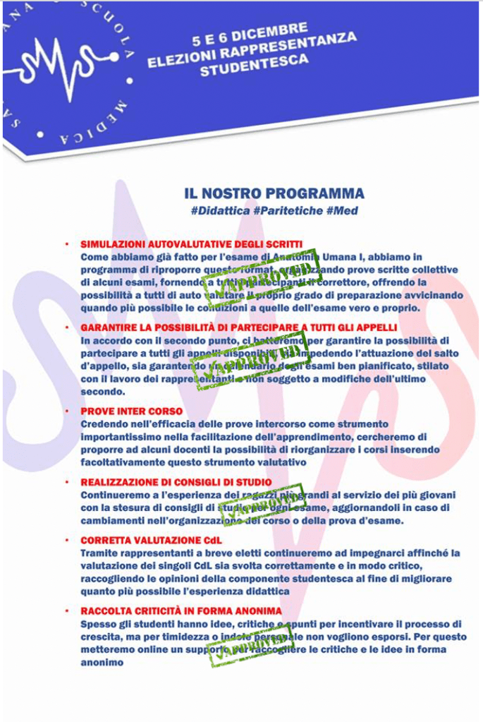 Ció che ha sempre contraddistinto la nostra Struttura é stato il rispetto del Programma Elettorale, su cui tutti i nostri rappresentanti, nel corso degli ultimi 10 anni, hanno lavorato in maniera verticale (dagli organi didattici fino agli organi Regionali e Nazionali).